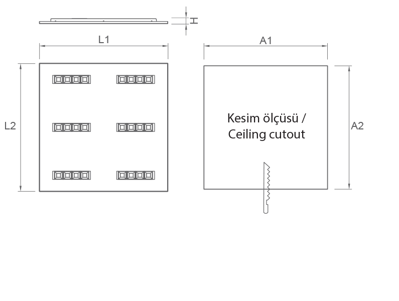 | Güç | Lamba | Çıkış Lümeni | Im/W | Ra | Renk | A1 | A2 | L1 | L2 | H | Kg | Kod |