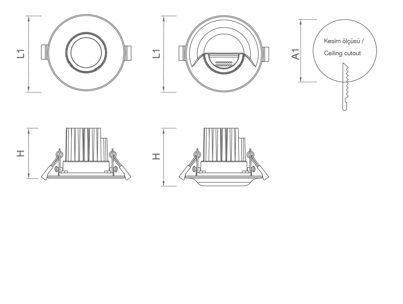 | Güç | Lamba | Çıkış Lümeni | Im/W | Ra | Renk | A1 | A2 | L1 | L2 | H | Kg | Kod |
