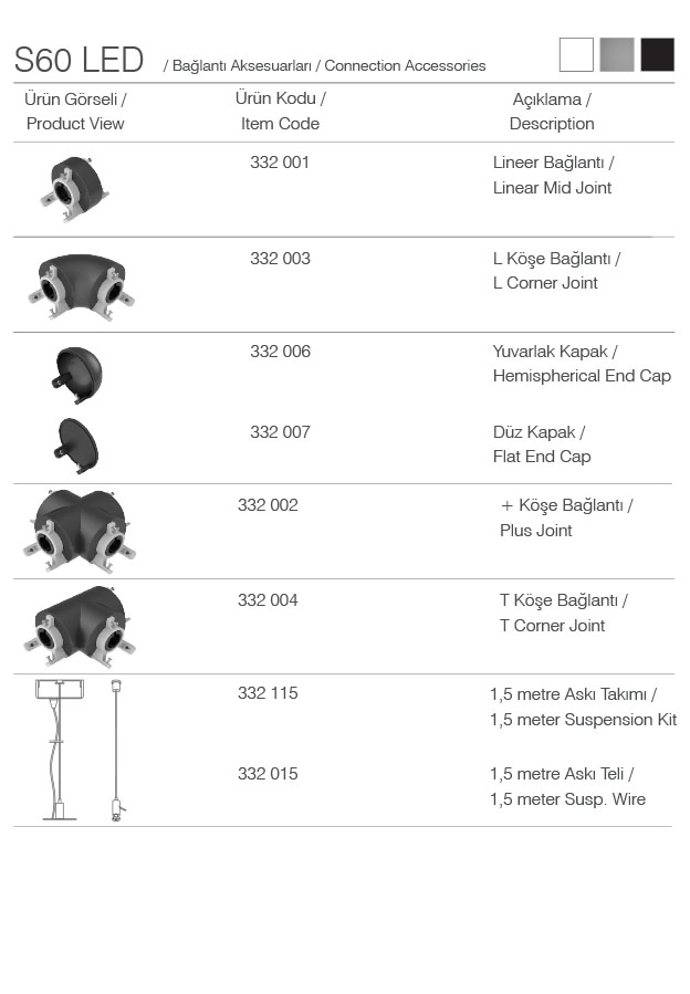 | Güç | Lamba | Çıkış Lümeni | Im/W | Ra | Renk | A1 | A2 | L1 | L2 | H | Kg | Kod |